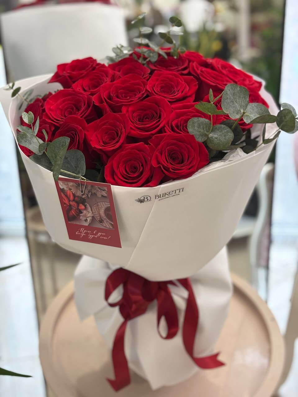 Букет из 21 красной розы с эвкалиптом в белой упаковке