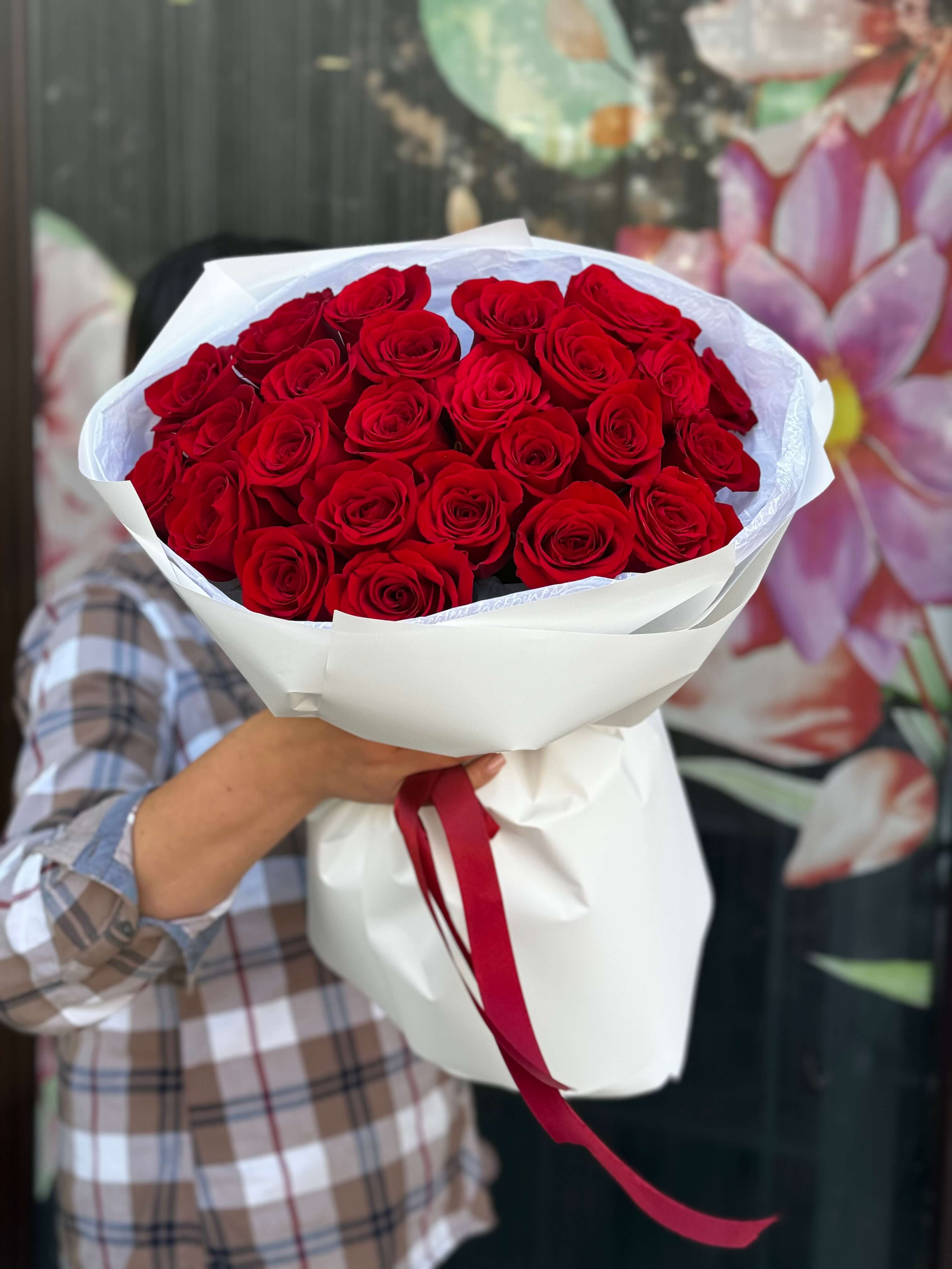 Букет из красных крупных роз сорта фридом 40см в матовой упаковке