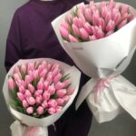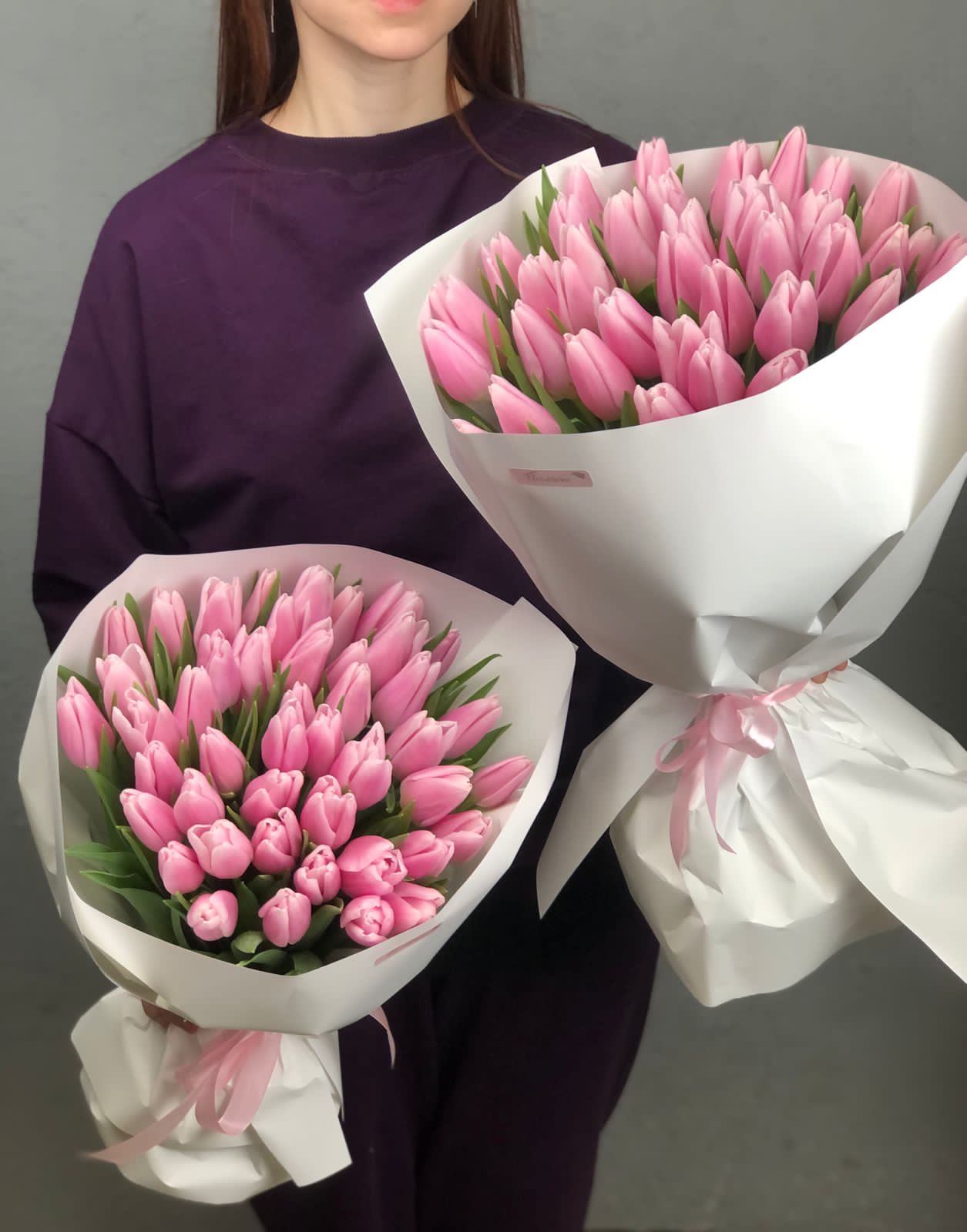 Букет из 51 розового тюльпана сорта сиси в белой упаковке