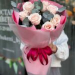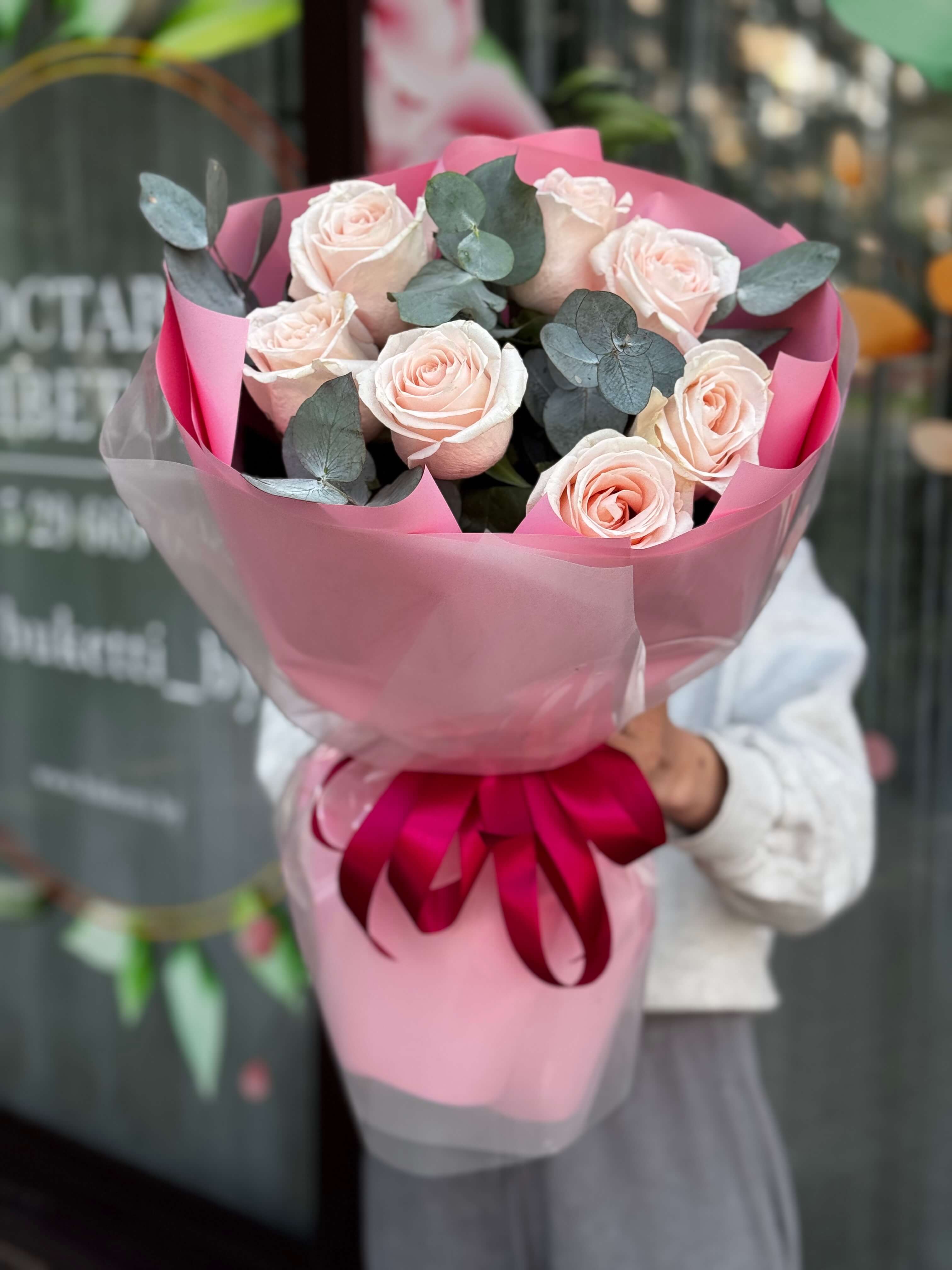Букет из 7 нежно розовых роз с зеленью эвкалипт