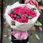 Букет ярких пионовидных кустовых роз сорта Жизель в матовой упаковке