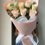 Букет из 7 розовых роз с эвкалиптом в матовой упаковке