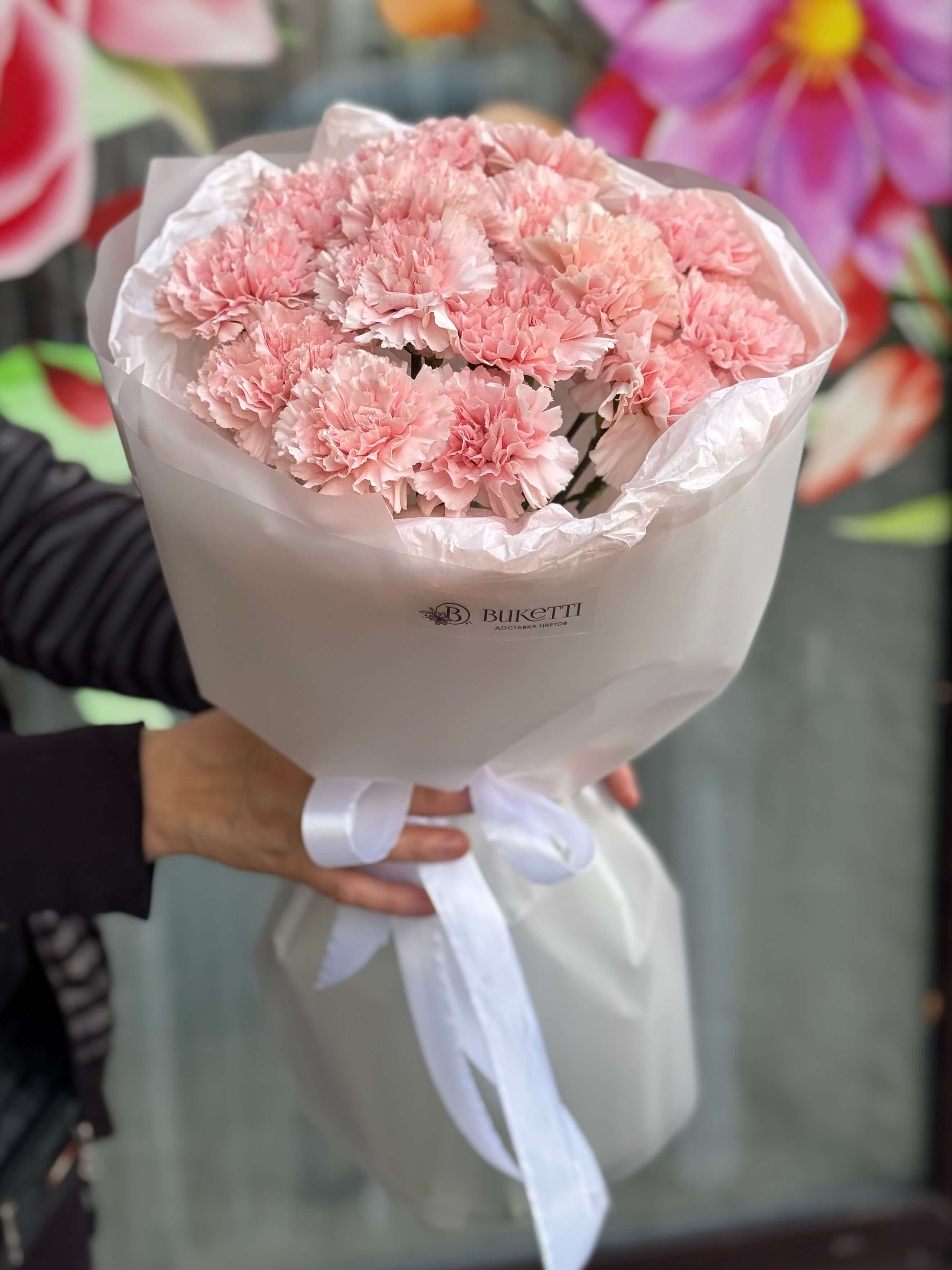 Букет из 15 нежно розовых гвоздик в матовой упаковке
