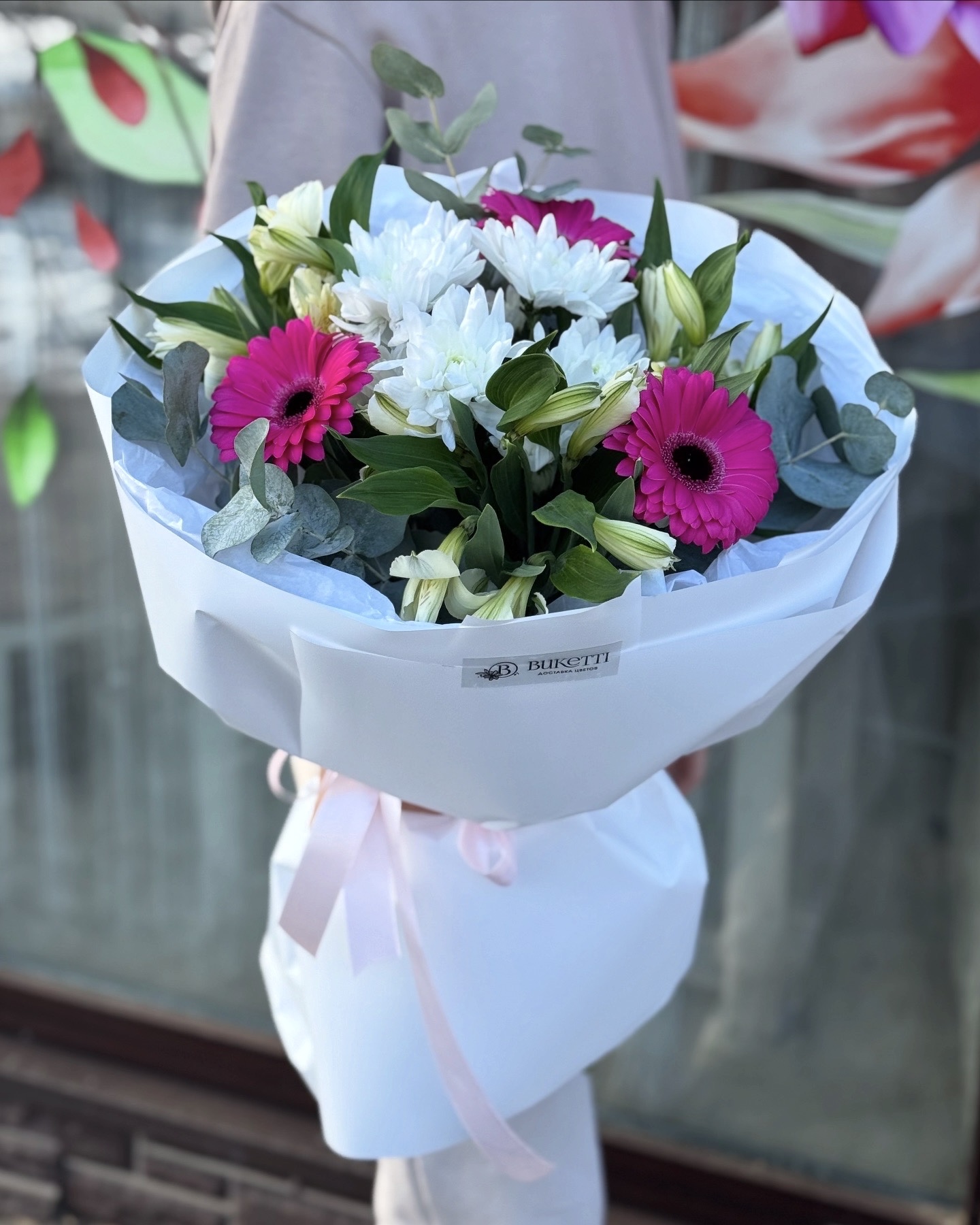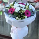 Букет сборный из 3 розовых гербер 3 альстромерий 1 хризантемы с зеленью эвкалипт в матовой упаковке