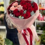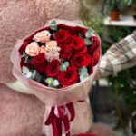 Букет из 7 красных роз 1 озатамнуса 1 кустовой розы с эвкалиптом