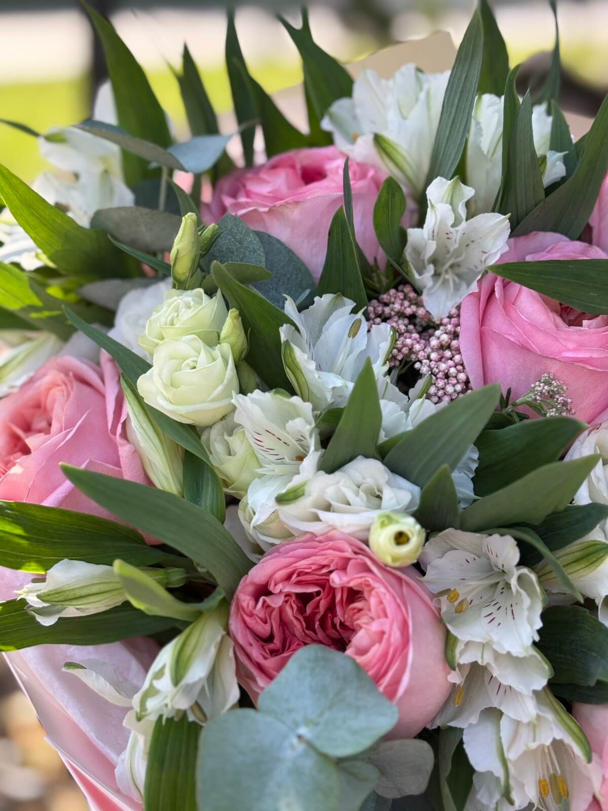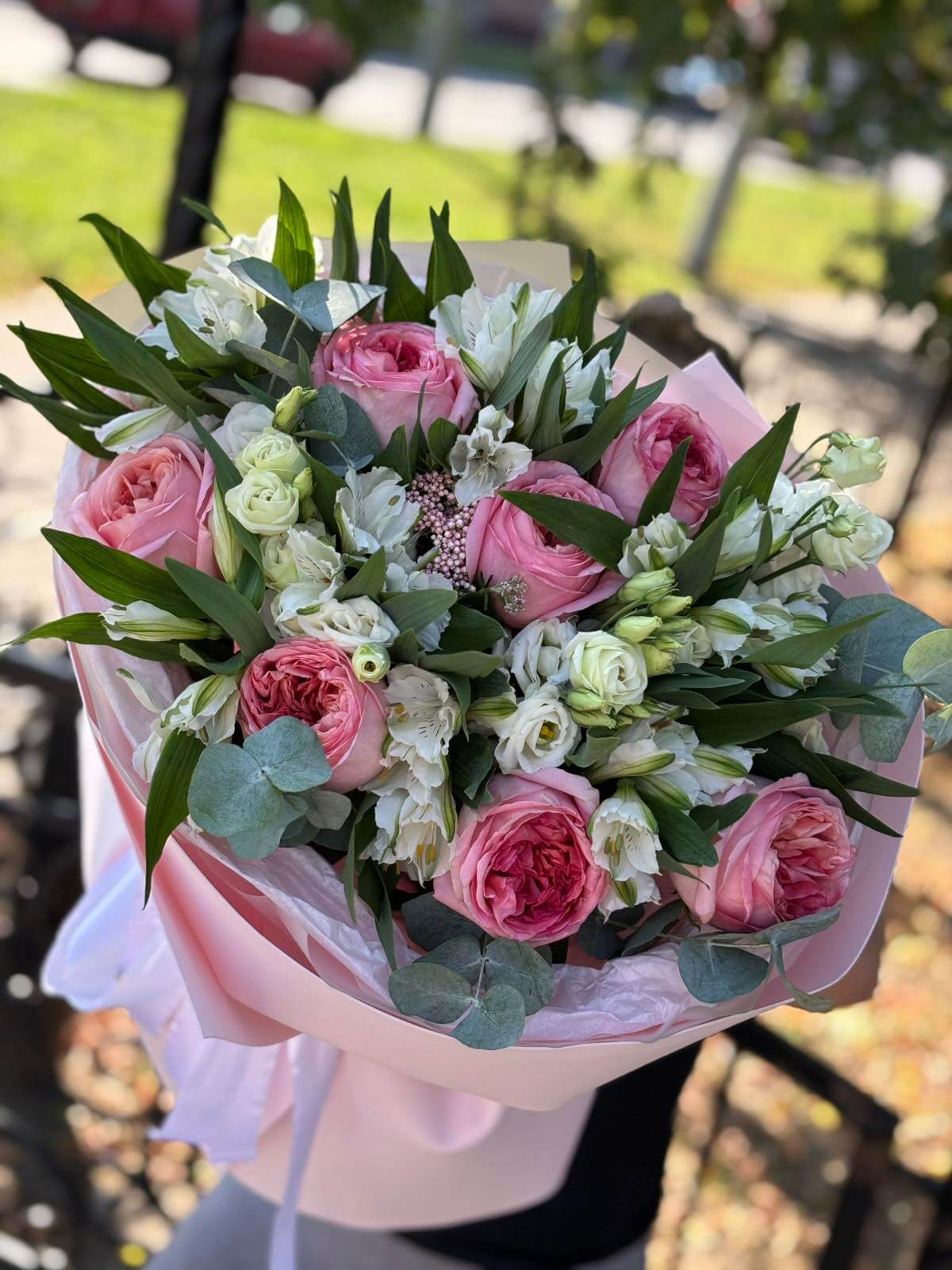 Букет из 7 роз Пинк Экспрешн 3 эустомы 7 альстромерий 1 азатамнус 1 эвкалипт упаковка