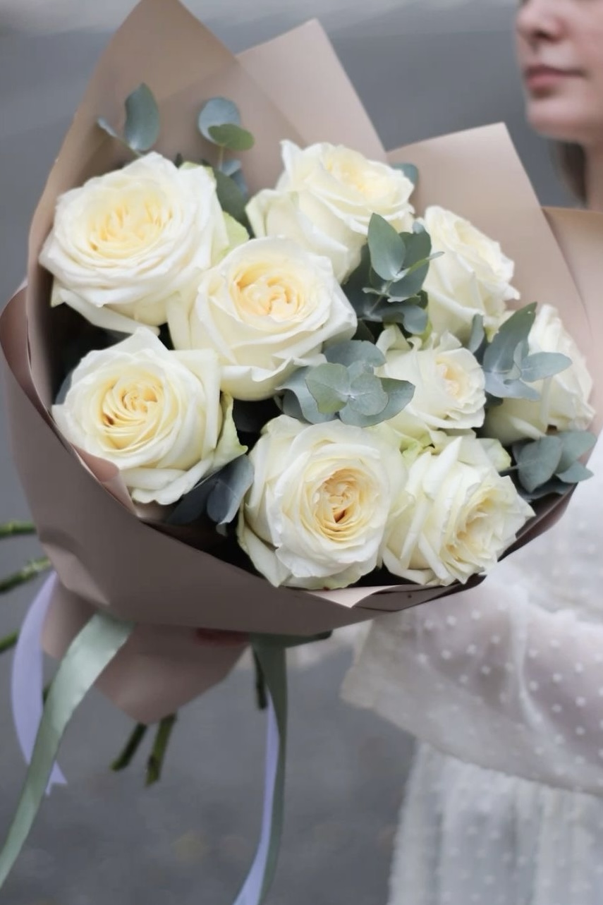 Красивый букет пышных пионовидных роз 9шт. с зеленью эвкалипт в матовой упаковке