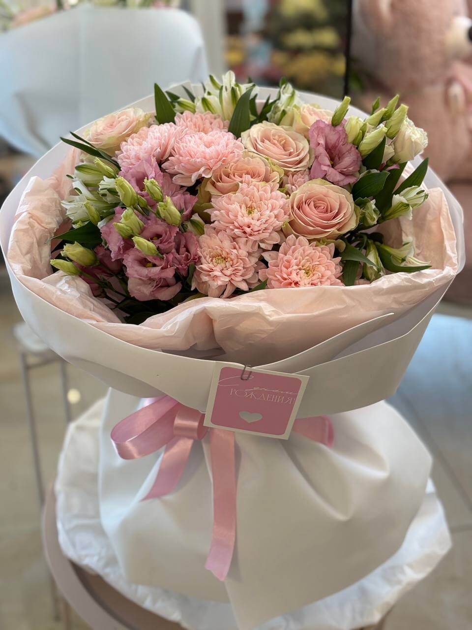 Сборный букет с хризантемой альстромерией розой и эустомой