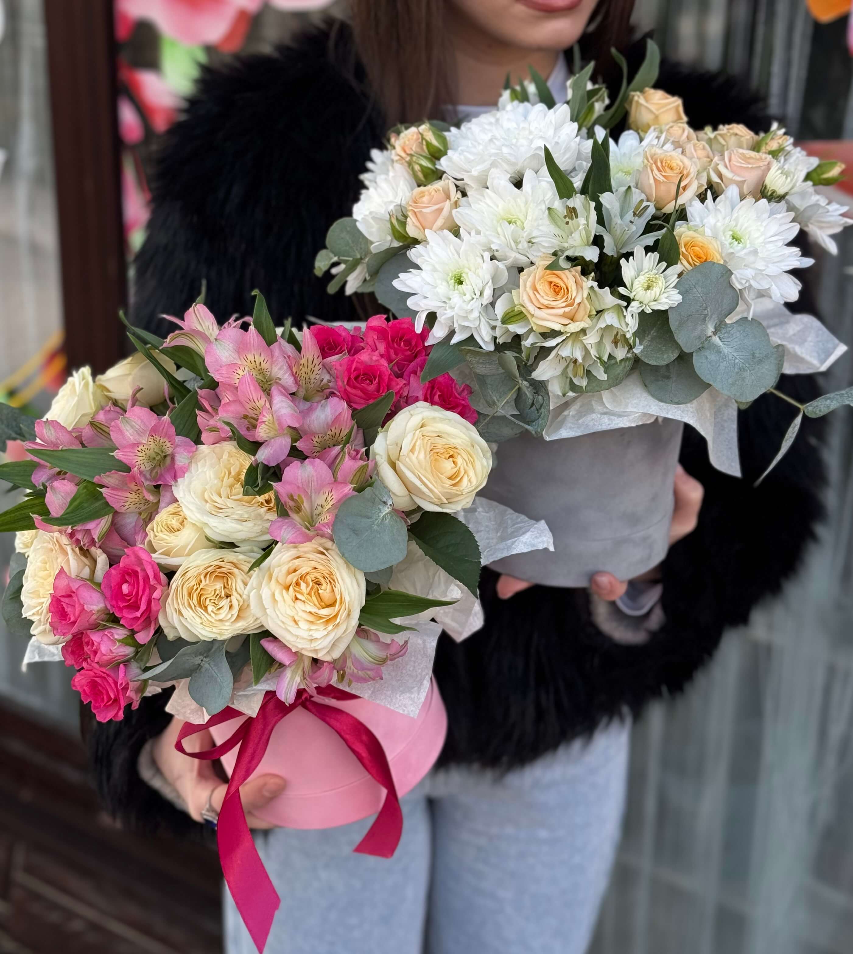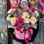 Сборная коробочка с кустовой розой альстромерией и эвкалиптом