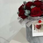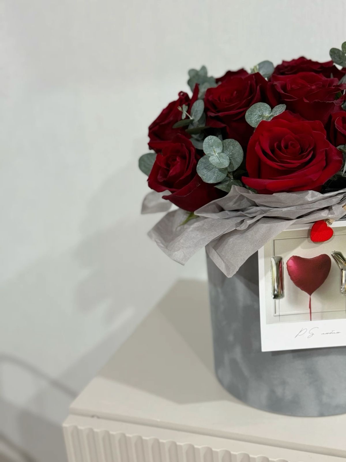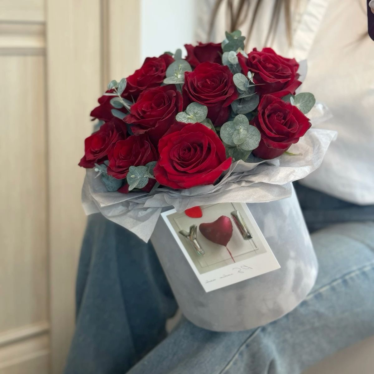 шляпная бархатная коробка из 11 красных роз с эвкалиптом